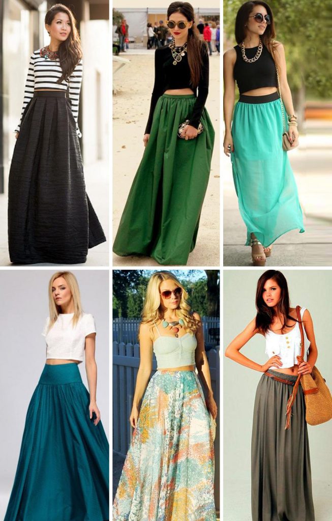 Різноманітні моделі довгих спідниць, які пропонуються дизайнерами, здатні знайти покупця з найбільш завищеними вимогами і особливим смаком. Різноманітні види тканин різних кольорів та візерунків, можливість комбінування з різною одягом роблять ці модні спідниці просто універсальними і незамінними в гардеробі. Для них використовується різна тканину, починаючи від щільної джинсового до легкої і пухкої шифоновою. Використання широких поясів і гумок допомагає виділити талію.
