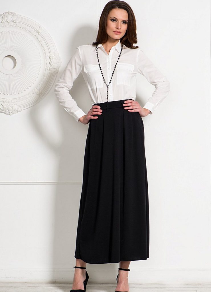 Для тих, кому все ще влітку потрібно дотримуватися ділового стилю, рекомендується чорна спідниця в підлогу. Це класика стилю, яка залишається модною в кожному сезоні. Таку річ одягають з білосніжним, молочним або блідо-рожевим верхи. Босоніжки чорні або коричневі. Не забувайте про аксесуар, яким може виступити як яскраве велике кольє, так і легкий прозорий шарф.