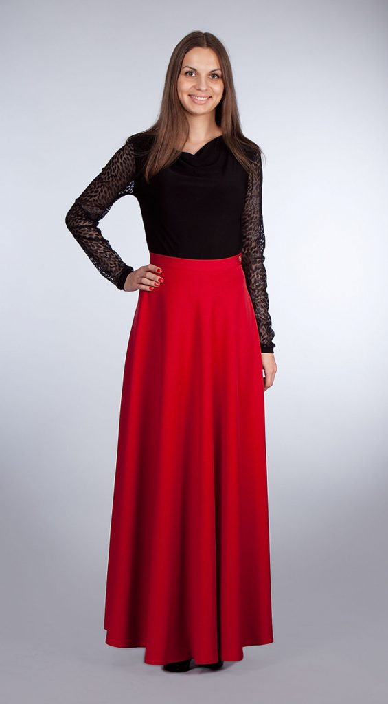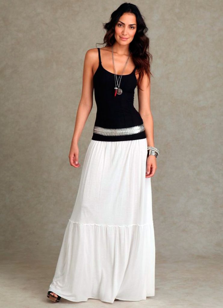 Біла довга спідниця – ще одне універсальне вбрання, до якого підійде практично все: починаючи від легких топів і ніжних блузок, закінчуючи грубої джинсового тканиною. А в поєднанні з модним червоним кольором ви отримаєте гарний викликає святковий образ.
