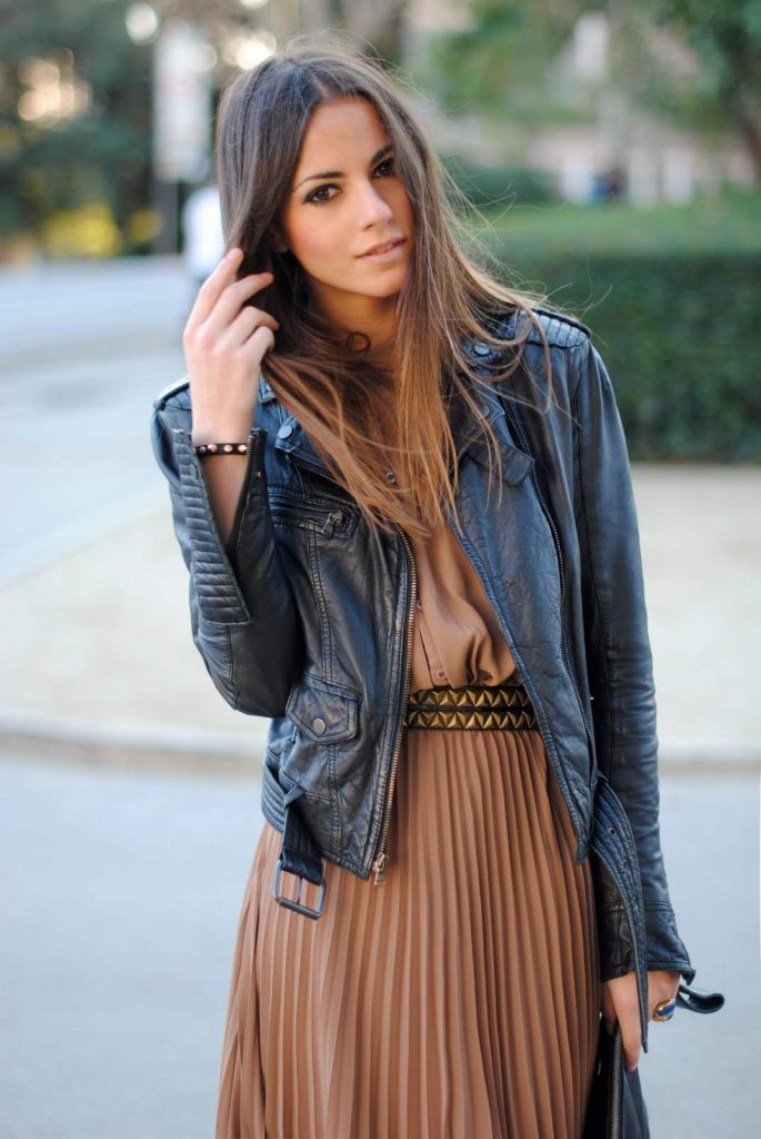 Красивим і ніжним спідниць такого крою чудово підійде сміливий верх – шкіряна косуха або джинсовий піджак поверх облягаючого топа або футболки.
