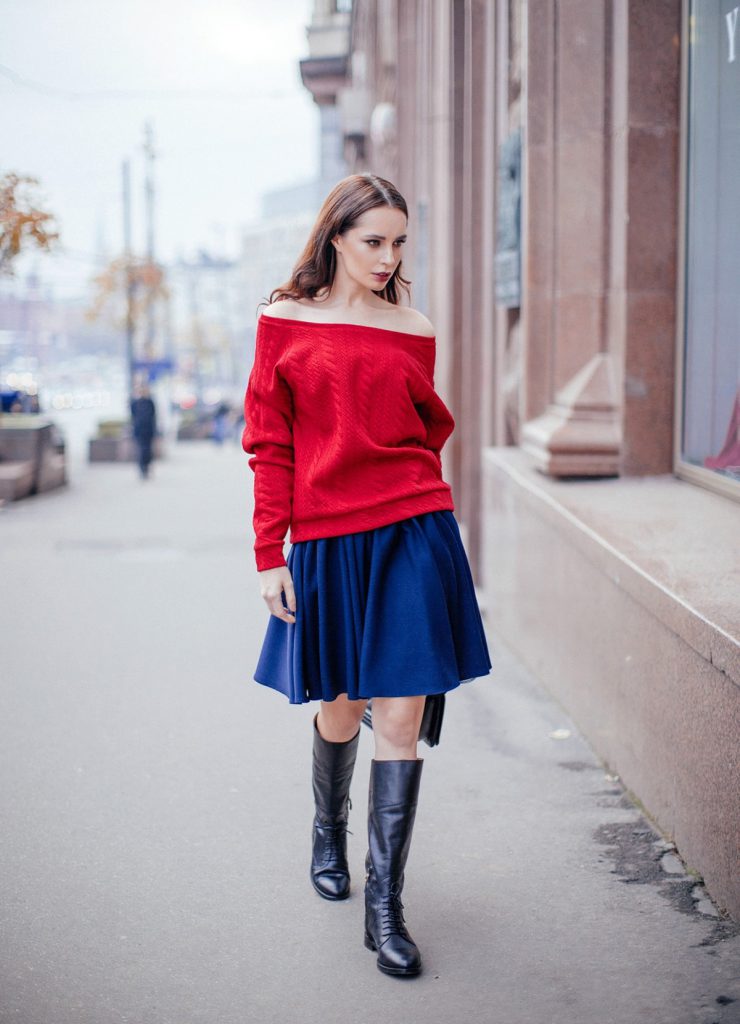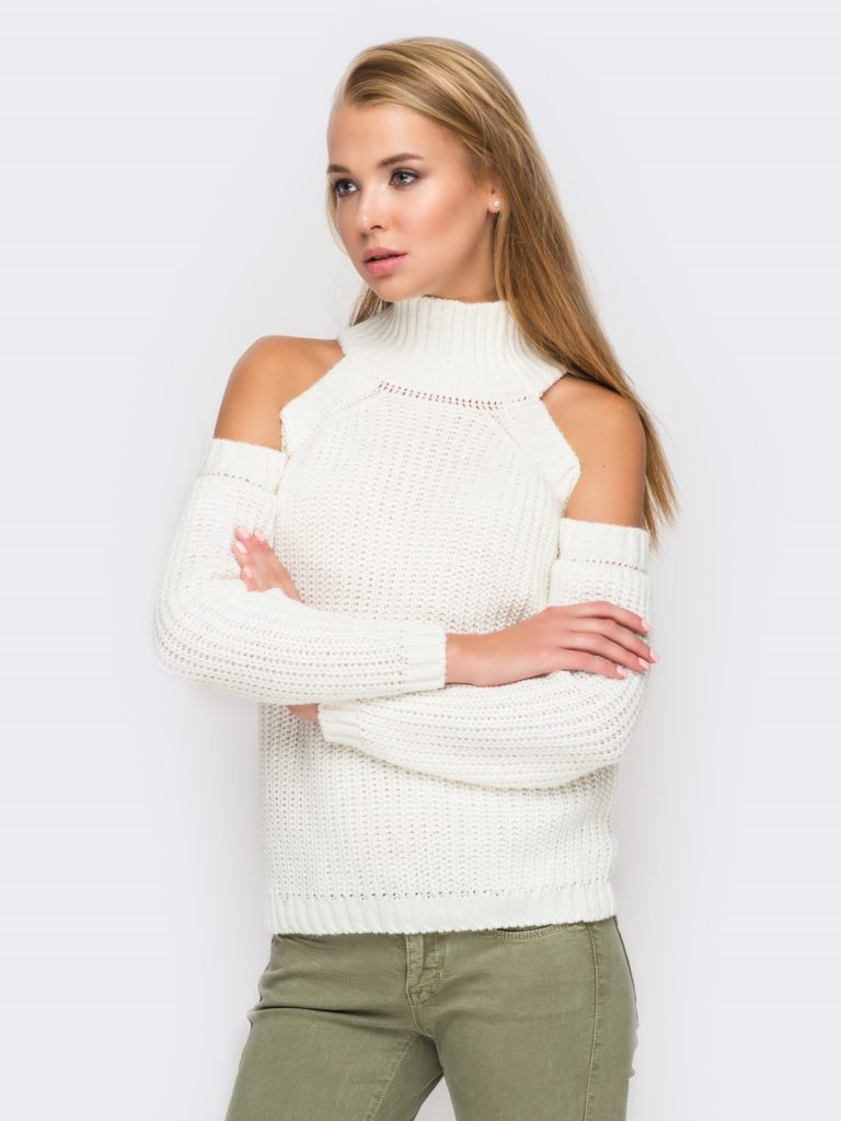 - Светр може як повністю відкривати плечі разом із зоною декольте, так і бути більш закритим.