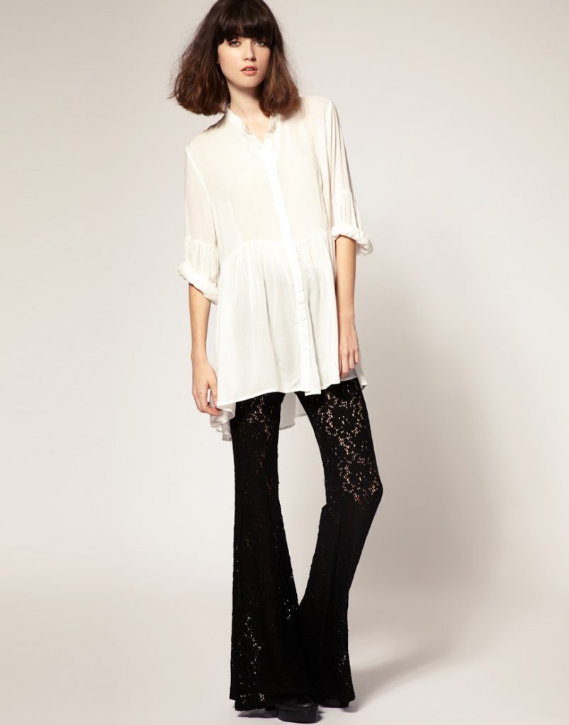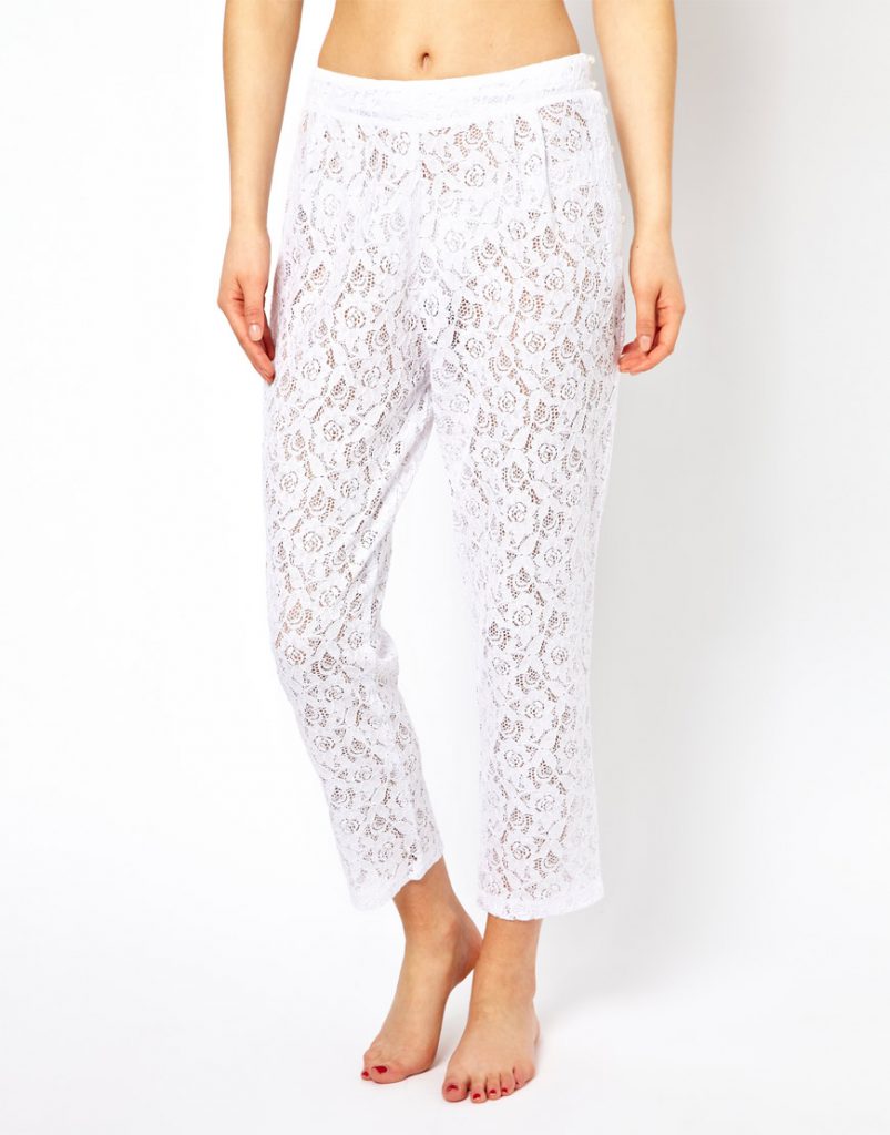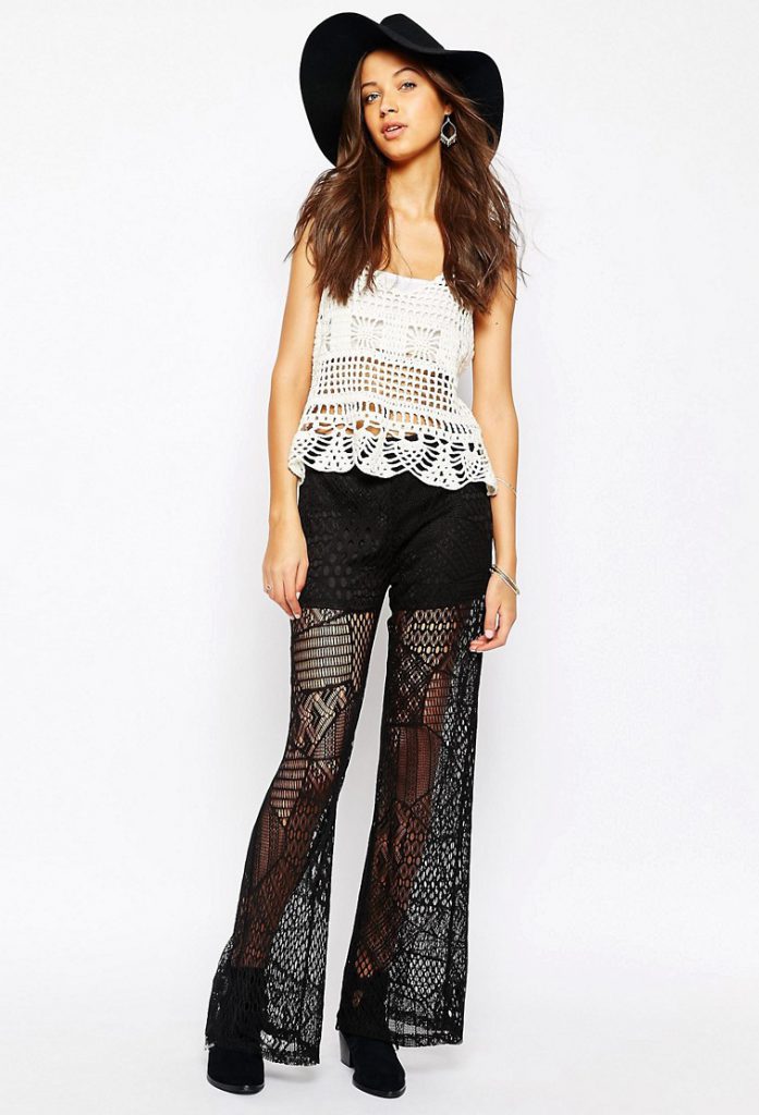 - Широкі мереживні штани. Це дуже смілива модель, яку не всі готові додати в свій гардероб. Запам’ятайте головне правило: якщо в брюках дуже багато частин тіла оголено таку модель потрібно надягати тільки на пляж. Якщо ви вирішите піти в такому образі в місто, вас можуть не правильно зрозуміти і називати вульгарною.