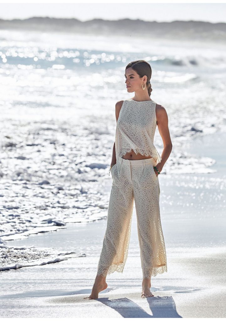 - Завужені укорочені брюки з мережива. Вони вважаються самими модними і оригінальними. Якщо брюки зі вставками угорі, які закривають інтимні частини тіла, тоді їх можна носити і в місті, і на пляжі, і на вечірці. Але якщо такої вставки немає, тоді модельєри радять надягати довгі майки або туніки, які будуть закривати надто оголені місця. В іншому випадку цю модель також можна буде надіти тільки на пляж.