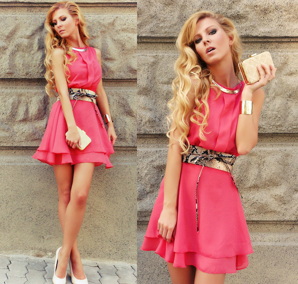 А для романтичних побачень і вечірок можна сміливо вибирати яскраво-рожеві відтінки облягаючих або вільних силуетів. Тут можна дозволити собі експерименти з кроєм сукні, використовуючи несподівані деталі у вигляді асиметричних розрізів, драпіровок, відкритих плечей і воланів. Або пофантазувати і надіти сукню зі стразами, або використовувати контрастні аксесуари зеленого, блакитного та помаранчевого кольорів.