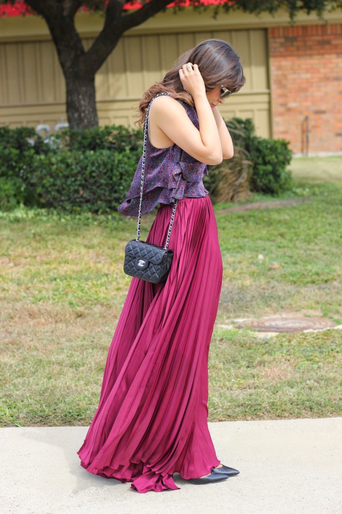 - Довга спідниця соковитого відтінку з нейтральним кольором верхи і сандалі на плоскій підошві.