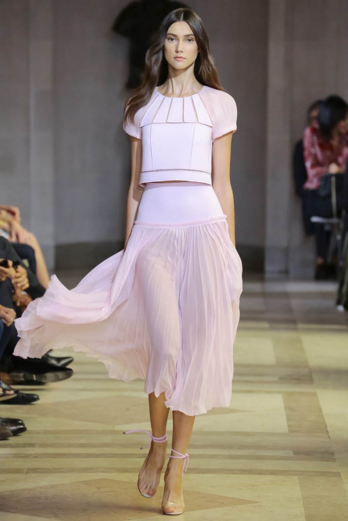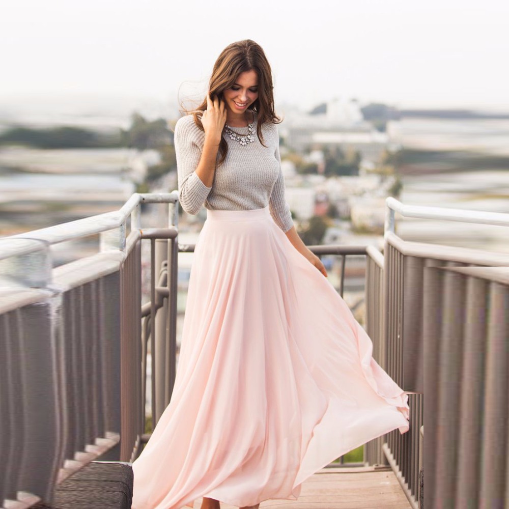 Довга спідниця в підлогу відмінний вибір для гламурної дівчини як літній одяг для прогулянок і романтичних зустрічей. Рожева спідниця блідого або ніжного відтінку підійде, якщо жінка вийшла з юного віку. Блідо рожева спідниця міді доречно і стильно виглядає в ансамблі для офісу. Таку спідницю представив модний дім Carolina Herrera — частково плісирована з довжиною вище кісточок.