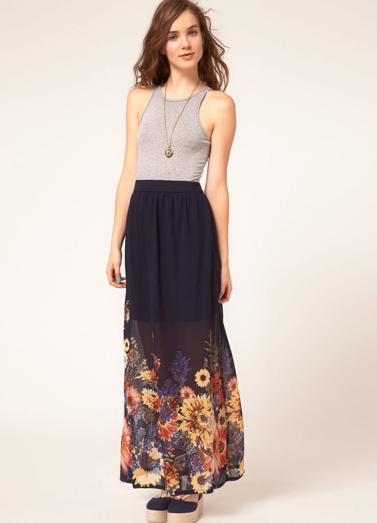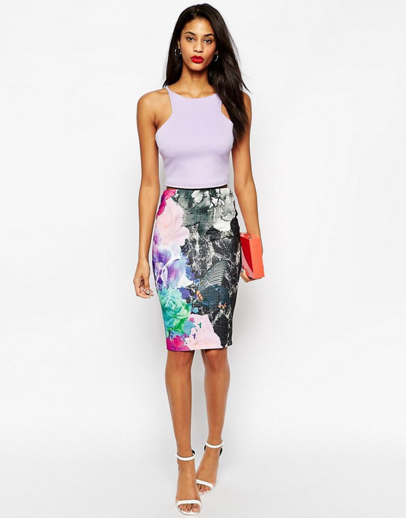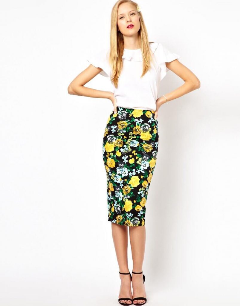 Але квітковий принт дозволяє трохи більше! Тому навіть синя сувора спідниця-олівець в підлогу при грамотному виборі верху стане хорошим рішенням для прогулянки або походу на вечірку. Взуття має бути на високому каблуці: туфлі-човники, босоніжки, відкриті ботильйони і т. д.
