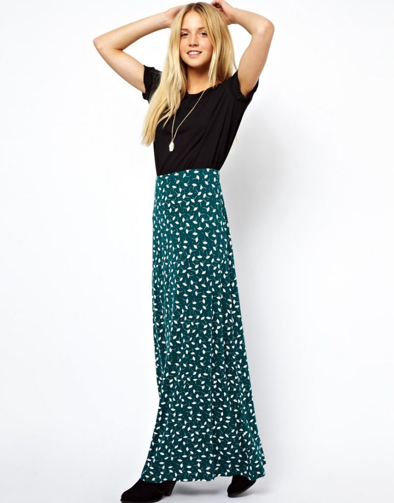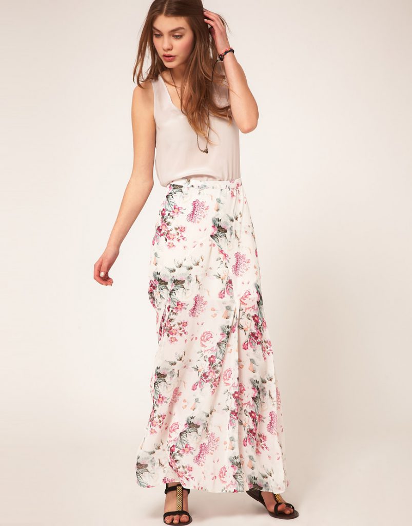 Якщо ж спідниця в підлогу має квіткові візерунки на білому тлі, то підійде як аналогічний білий, так і чорний верх. Не менш оригінально виглядатимуть і однотонні речі, колір яких повторює один з кольорів на принті (синя гама, біла, зелена і т. д.). Звичайно, його не повинно бути дуже мало — білу спідницю в підлогу з рожевими квітами краще доповнити рожевим верхи.