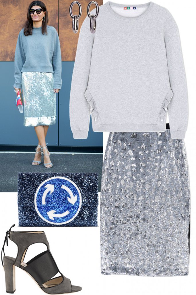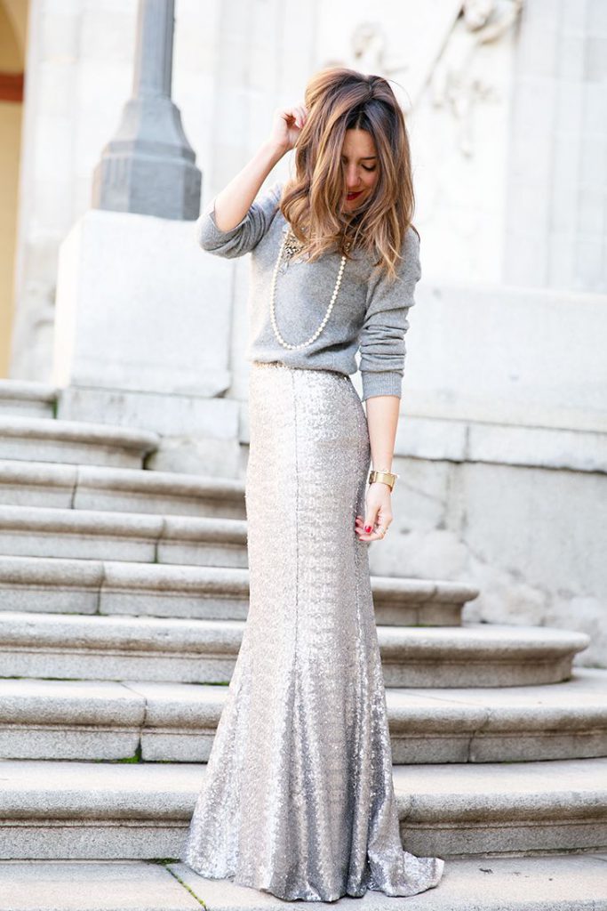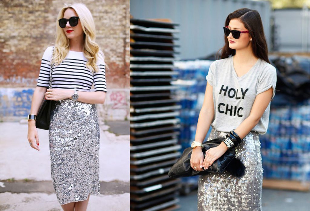 Для любителів носити футболки спідниця в паєтках стане справжньою знахідкою. Для створення зухвалого образу модної бунтарки потрібно довга чорна або сіра спідниця в підлогу і графічна футболка. Блискучий декор можна «підкріпити» за допомогою яскравого чокера або прикраси на голову. Інших аксесуарів не потрібно.