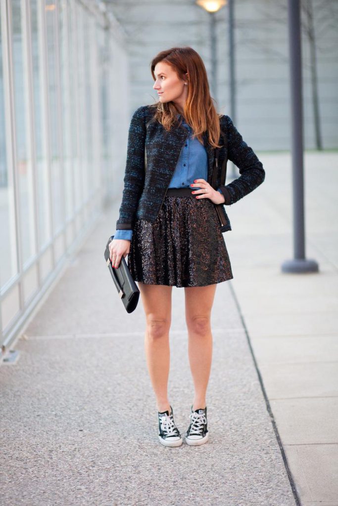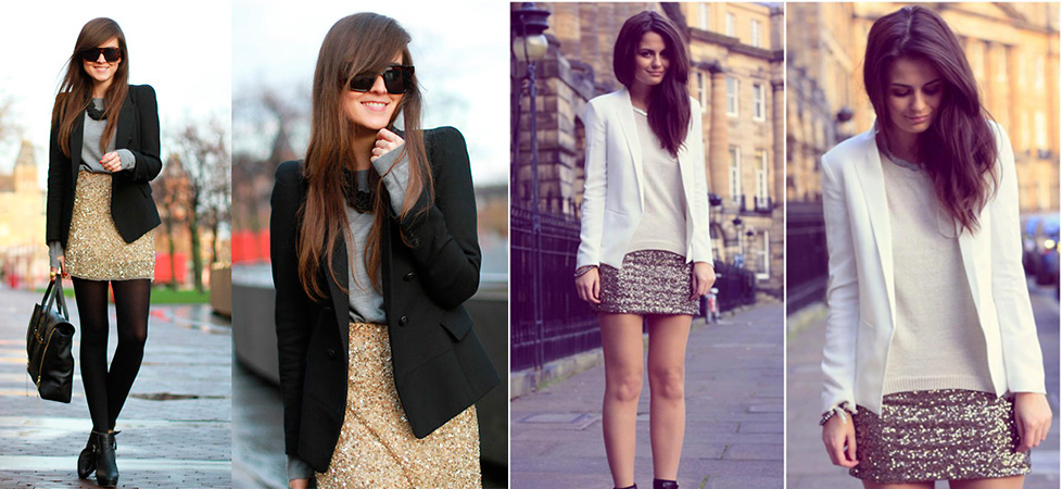 Строгий блейзер темного кольору зможе коректно приглушити розкішний блиск спідниці. Таке вбрання можна носити навіть на роботу, за умови, що на роботі відсутній строгий дрес-код.