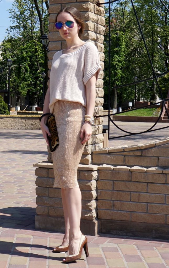 Головне правило успішного комбінування спідниці олівець з паєтками – яскраві блискучі елементи виступають у ролі допоміжної ефектною фурнітури, але ніяк не можуть бути основою для лука. Будь-які формати «тотал» тут не доречні.
