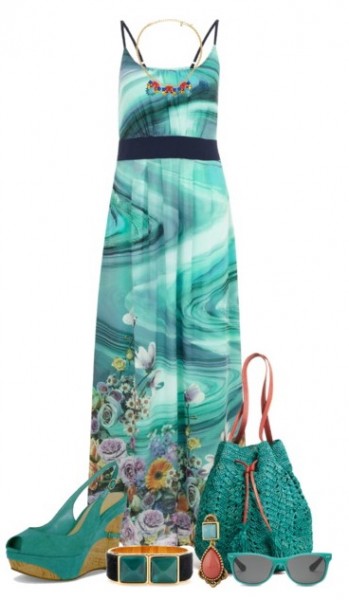 Ще один чудовий жіночий образ для чудового літа: легкий літній сарафан бірюзового кольору на бретельках ідеально виглядає в поєднанні з сандалями такого ж кольору, сонцезахисними окулярами, смарагдовим широким браслетом і сережками. Красива літня сумочка вдало доповнює цей ансамбль. Бірюзове плаття для справжніх леді!