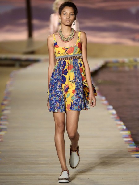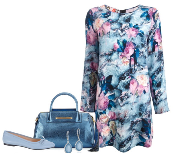 Тут ми бачимо день ансамбль яскравим акварельними принтом. Ви можете стиль його з укороченим синім блейзер і червоний плоский насоси.