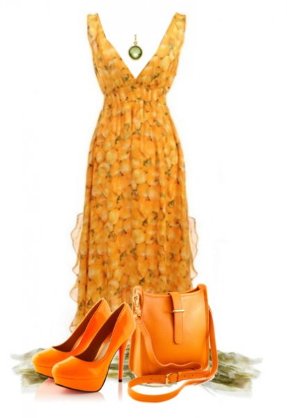 Оранжевий літній сарафан з V-подібним вирізом без рукавів виглядає яскраво і соковито! Яскраво-помаранчеві туфлі на високому каблуці виступають в комплекті з невеликого розміру помаранчевої сумкою. Рекомендується прочитати: Помаранчеві літні сукні