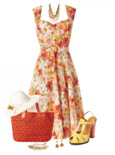Любите ретро-образ? Тоді це для вас! Літній сарафан з квітковим принтом, жовтими сандалями з відкритою п’ятою, біла річна капелюх і в’язана сумка соковито-оранжевого кольору. Як на рахунок аксесуарів? Будь ласка! Помаранчеві сережки у вигляді квітів йдуть в комплекті з квітковим браслетом.