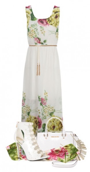Тут ми бачимо літнє плаття міді білого кольору з квітковим принтом і піджаком подібного формату. Квітковим принтом прикрашений жіночий клатч. Літні сандалі золотого кольору гармонійно доповнюють цей романтичний, жіночний образ. Літній сарафан для спекотного літа