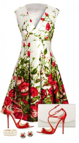 Як носити білий наряд з V-подібним вирізом з яскраво-червоними маками в поєднанні з зеленими листочками, в комплекті, цілий ансамбль у поєднанні з червоними сандалями з червоними ремінцями на високому каблуці. Образ гармонійно завершує червоні сережки з білим браслетом і клатчем білого кольору.
