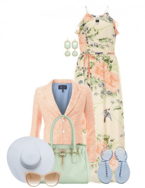 Любите пастельні тони і романтичний, жіночний образ? Тоді це для вас!Довгий легкий літній сарафан з квітковим принтом у поєднанні з блакитними сланцями, прикрашене бісером. Салатова сумка, біла капелюх і сонцезахисні окуляри. Рожевий елегантний піджак допоможе вам не замерзнути ввечері, коли прохолодний вітерець з моря дме все наполегливіше.