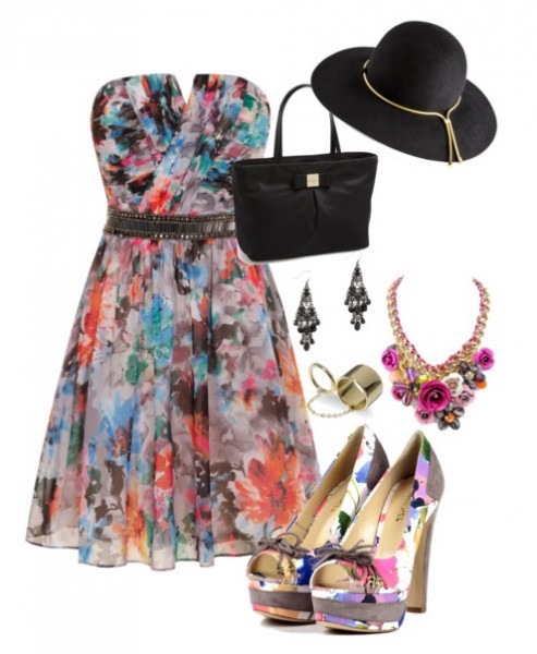 Елегантна чорна крислатий капелюх з чорною сумкою, довгими сережками і намистом у вигляді квітів становить гідний ансамбль річному легкому квіткового сукні і туфлями.