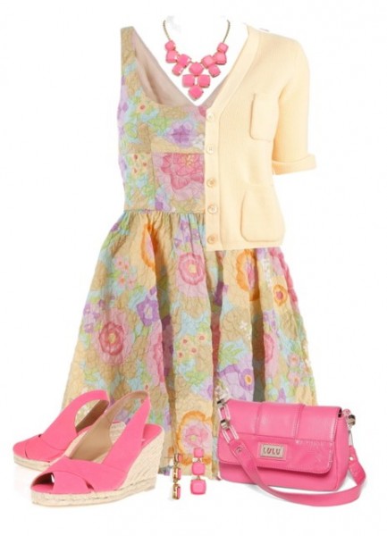 Деякі жінки і дівчата люблять носити охайний образ 1960-х років. Тут ми бачимо блідо-жовтий кардиган, який можна носити поверх расклешенного сукні, яка доповнена блідо-рожевими сандалями і такого ж кольору клатч.