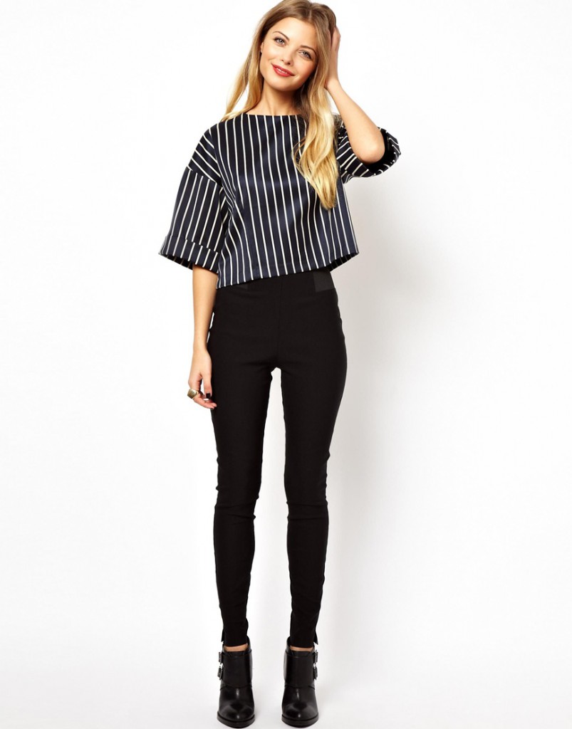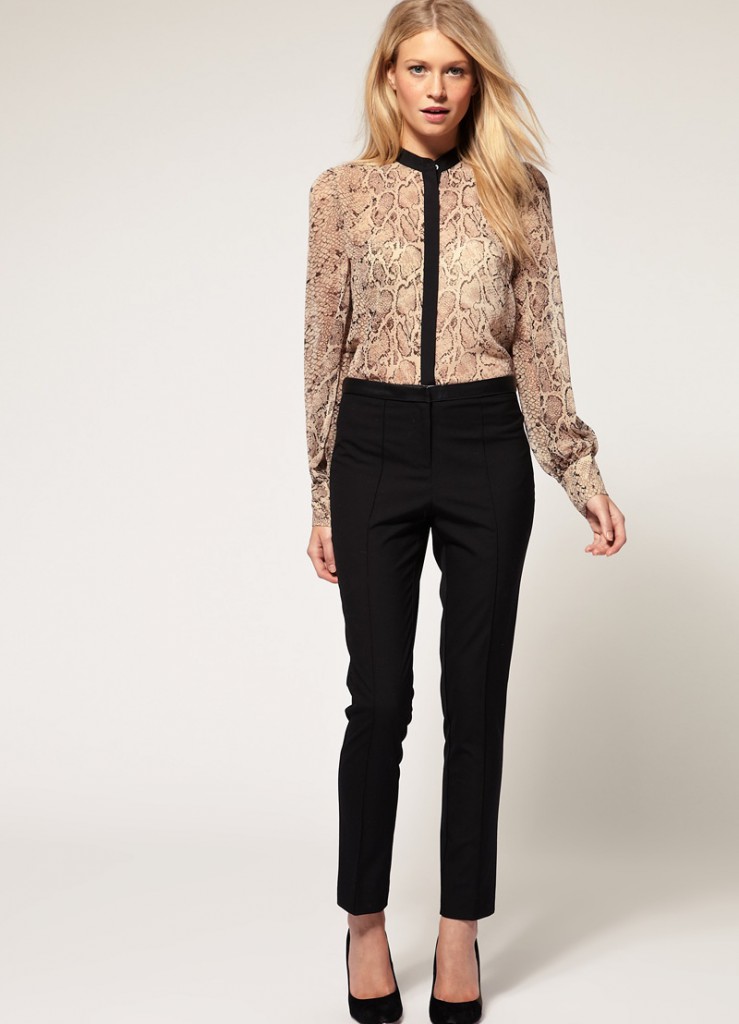 Чорні штани в обтяжку — улюблений фасон багатьох дівчат. Вони відмінно поєднуються з сорочками в клітку, горошок, смужку. Блуза з баскою — також прекрасний варіант під вузькі брюки. Сорочки з підкоченими рукавами також підходять до таких штанів. Принт верху може бути найнесподіванішим в горошок, смужку, у флористичному стилі. Доповнять вузькі брюки чорні ботильйони або лакові лофери.