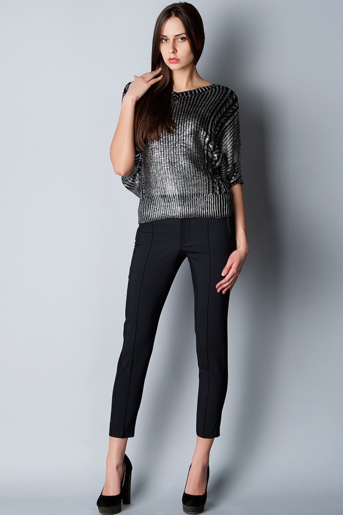 Вузькі брюки відмінно поєднуються з об’ємними в’язаними светрами, однотонними джемперами, косухами.