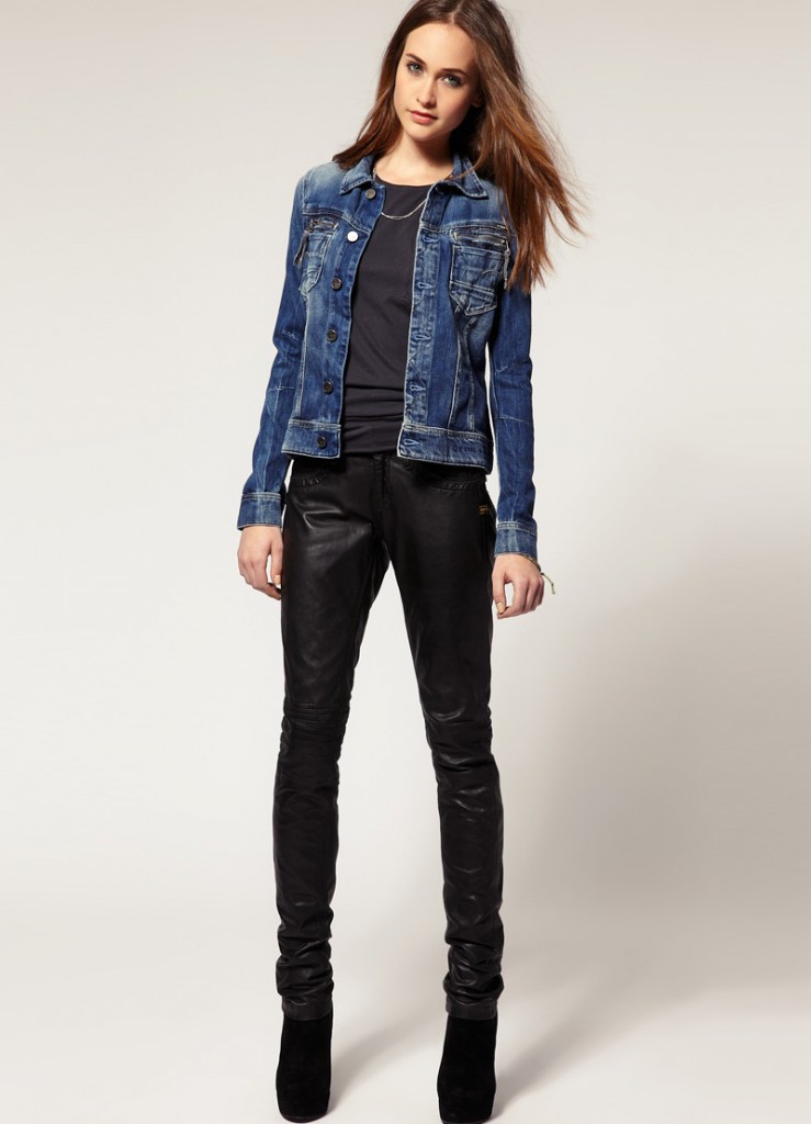 Шкіряні штани відмінно виглядають з куртками з цього ж матеріалу. Прекрасний варіант в якості верху — однотонна водолазка, кофта з вирізом-човником. Шкіряні штани ідеально виглядають з ботильйонами. Туфлі-човники також можна використовувати як варіант.