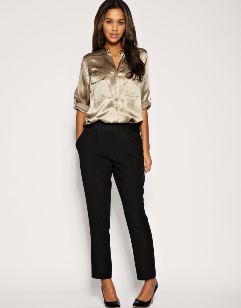 Атласні штани, безумовно, виглядають більш виграшно з взуттям на підборах.