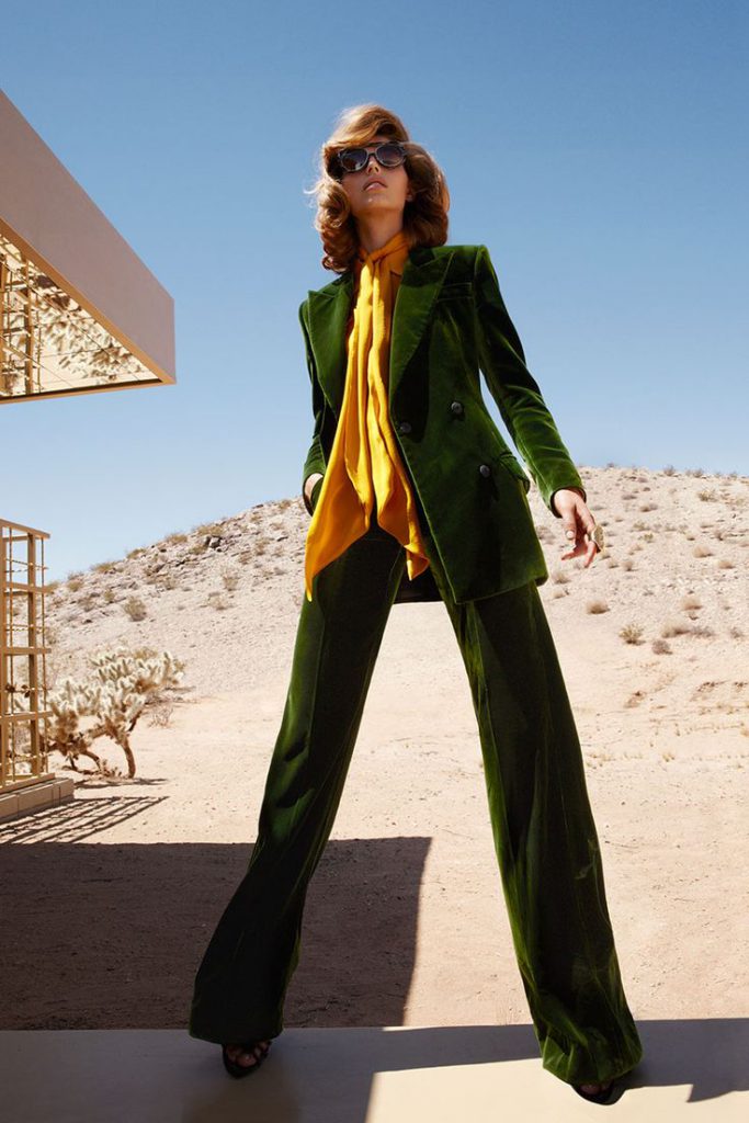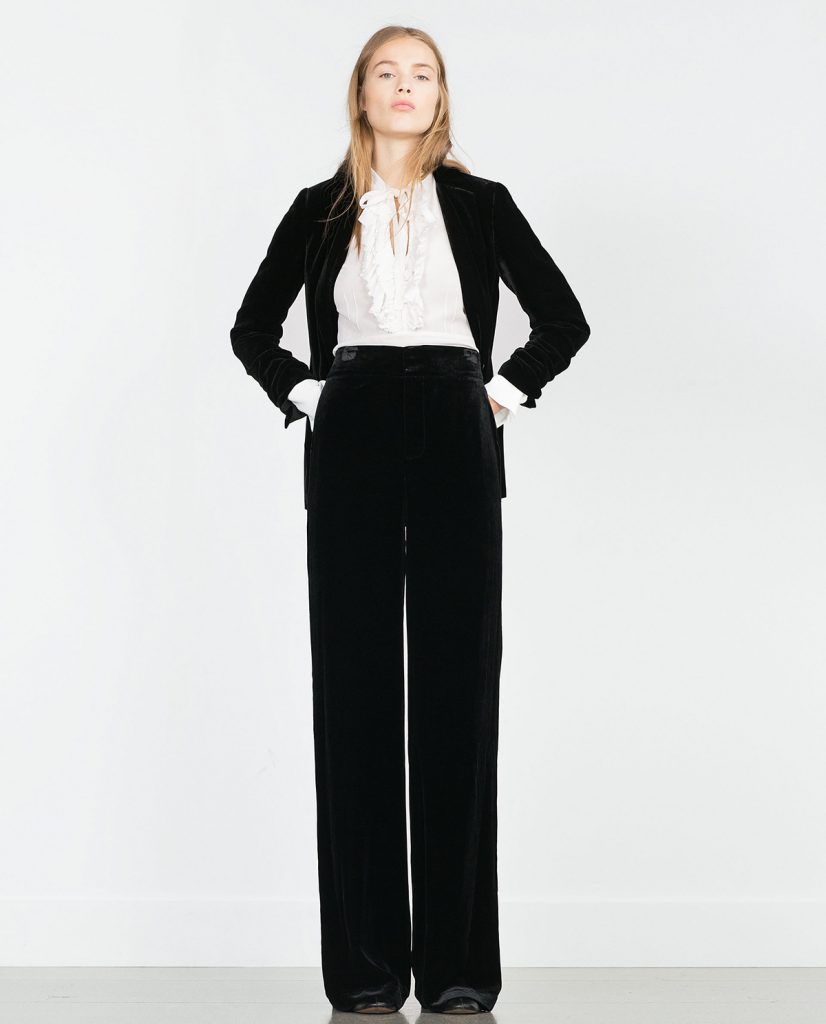 Оксамитові штани відмінно працюють в комплекті з жакетом з цього ж матеріалу. Жіночий жакет рівного крою витягує фігуру, роблячи її стрункою і витонченою. У нинішньому сезоні костюм з розкльошених оксамитових штанів і піджака виходить на вершину популярності. Цей образ, що прийшов з 70-х, нині захоплює модні обкладинки журналів і обіцяє бути досить успішним.