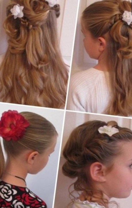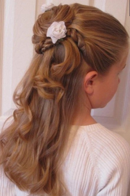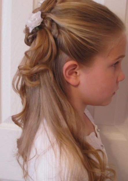 волоссям, які залишилися розпущеним, цікавий пучок. Прикрасьте зачіску гумкою з бантом або квіткою. Така святкова зачіска для дівчинки не
