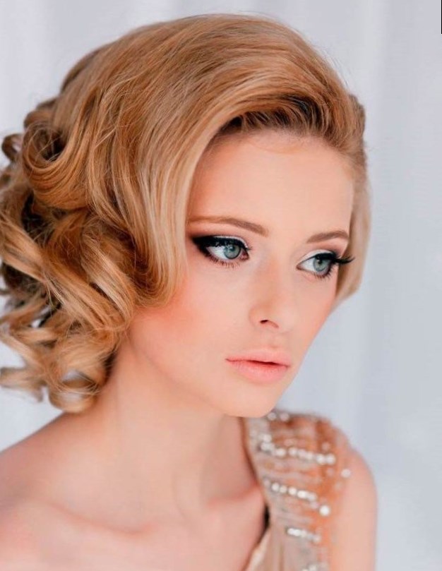 Великі голлівудські локони, укладені на один бік. Красива вечірня зачіска, зразок жіночності і