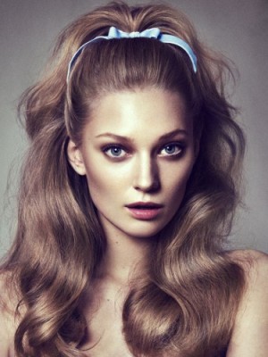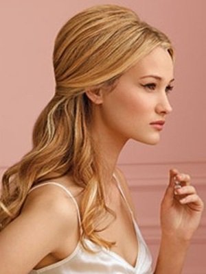 Укладання простіше не придумати – необхідно всього лише зачесати назад передні пасма і скріпити їх на потилиці. Краще зробити начісування, щоб силует був оформленим. На потилиці пасма кріплять невидимками або пов’язують стрічкою, не зайвим виявиться бантик. Оригінальною зачіска стане сплетеною з трояндочкою з ваших власних волосся. Розпущене пасма завийте м’якими хвилями.