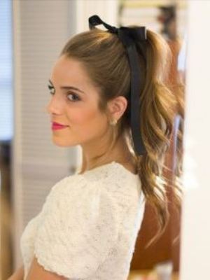 Зберіть високий хвіст, накрутіть плойкою кінчики і пов’яжіть стрічку біля основи хвоста.