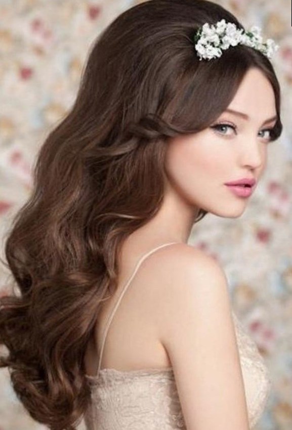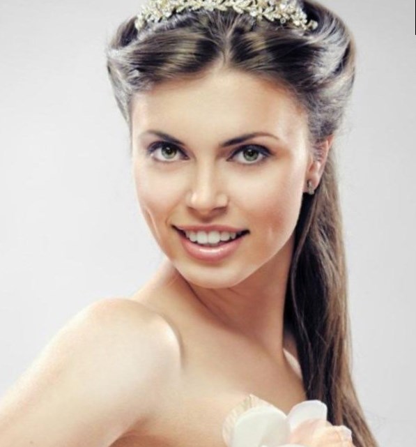 Зачіска на весілля з довгого волосся може бути прикрашена стилістом казкової діадемою, закріпленої з боків