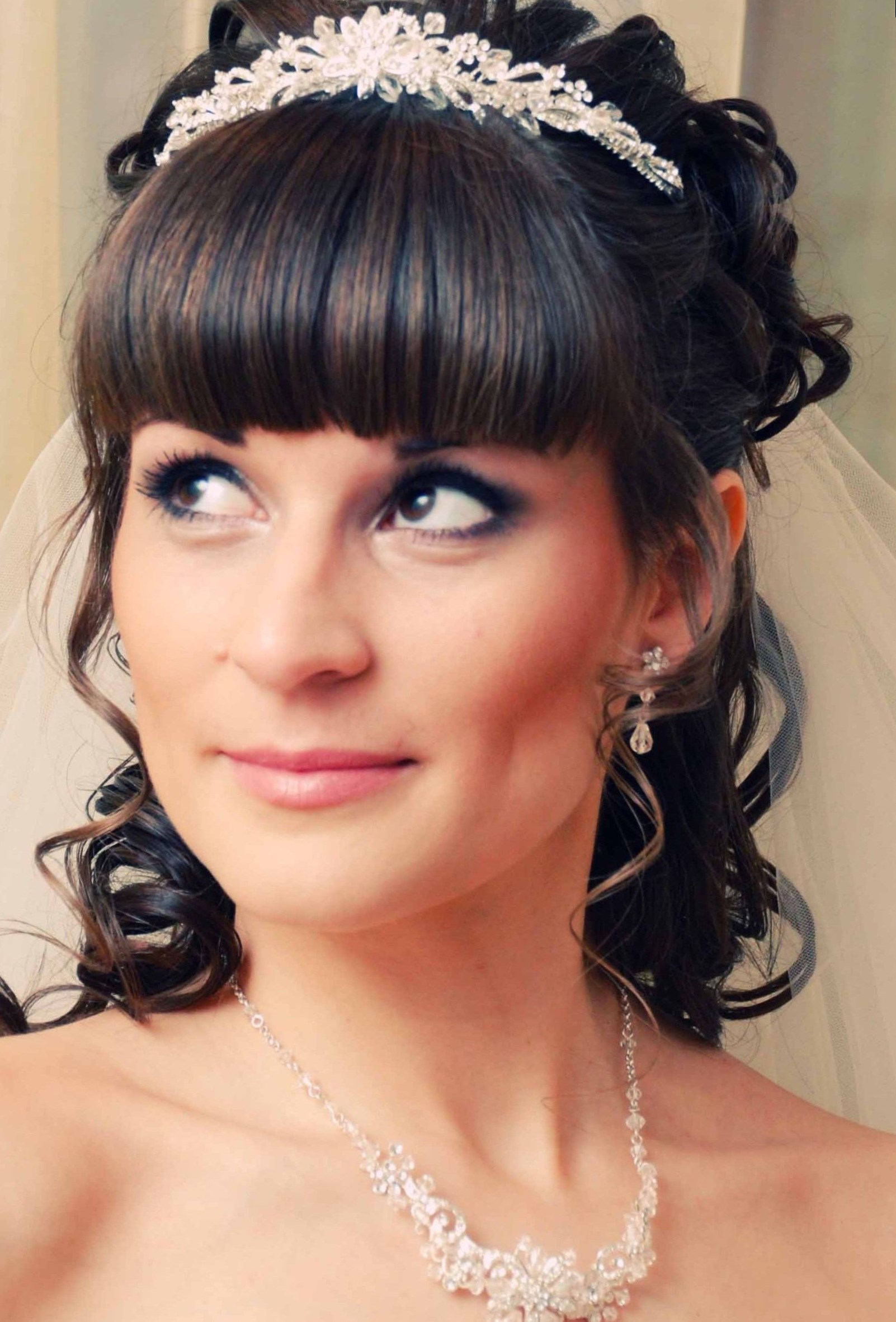 Весільна зачіска з діадемою, фатою і чубчиком виглядає добре на волоссі будь-якої довжини. В залежності від глибини чубчика, прикраса може розташовуватися