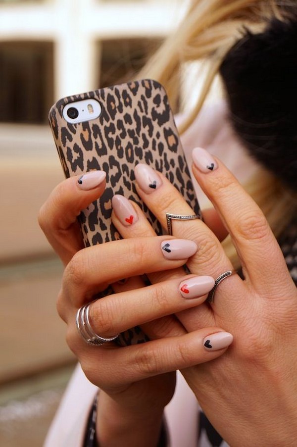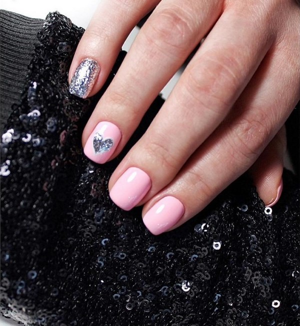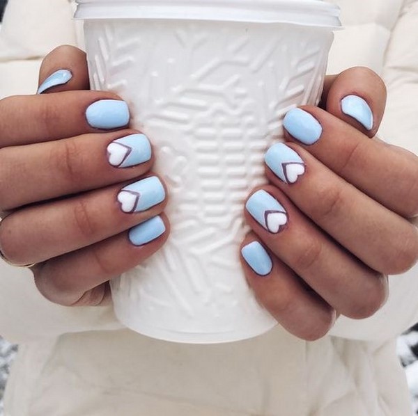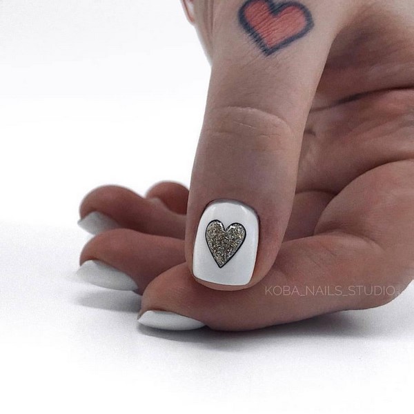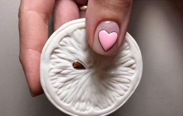 Лаконічність вітається і в модному дизайні нігтів на 14 лютого, що зробить пальчики особливо акуратними, а серцевий манікюр – мегастильным. Маленькі сердечка можна намалювати на кожному пальчику біля лунки або на парочці пальчиків з допомогою гліттера, що виглядає мило і ніжно.
