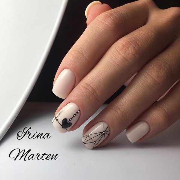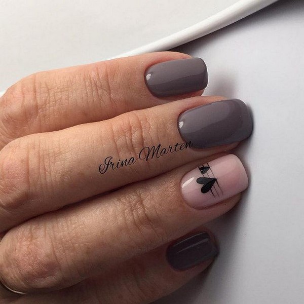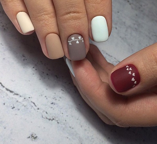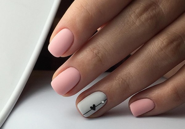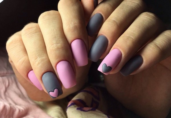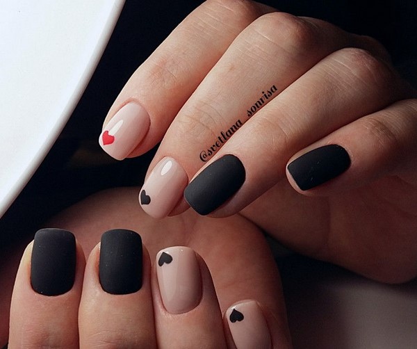 А от якщо ви бажаєте підшукати модний манікюр з сердечками в стилістиці Дня закоханих, що був би доречний для офісу та ділового образу, тоді сміливо віддавайте перевагу матовому дизайну в спокійній гамі відтінків з лаконічними сердечками на нігтях.
