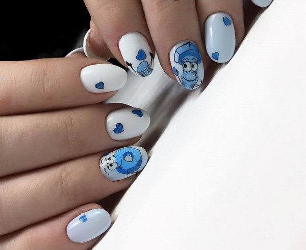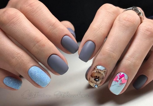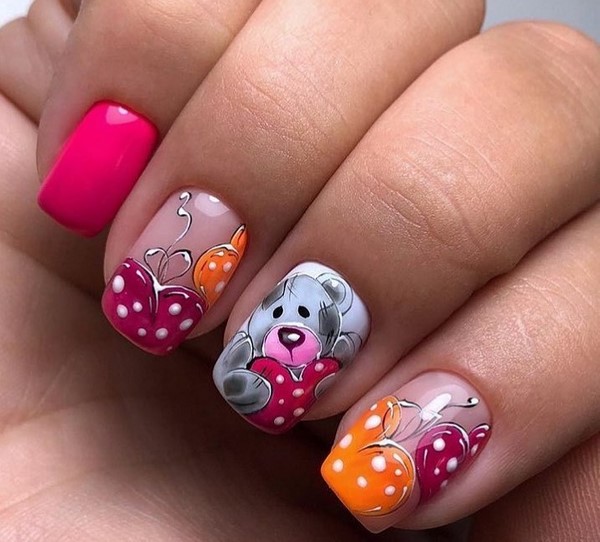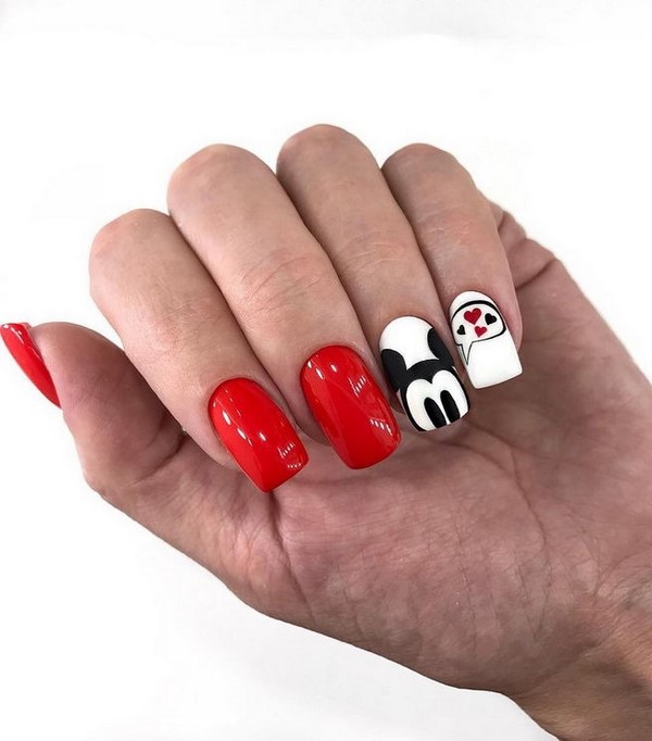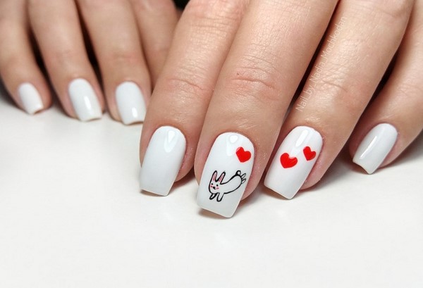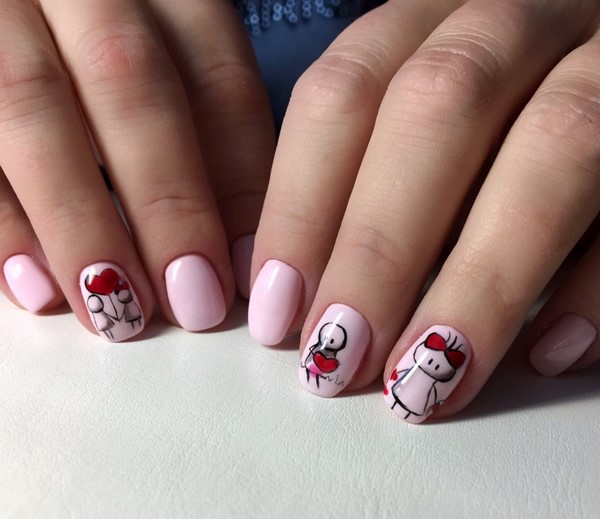 Закохані парочки або ж грайливі мультяшні персонажі стануть відмінним декором для красивого дизайну нігтів на День Валентина в сезоні 2019-2020 роки. Мінні і Міккі Маус, ведмедика і зайчика, силуети закоханих на нігтях з сердечками так мило і чудово перетворять ваші пальчики на 14 лютого.