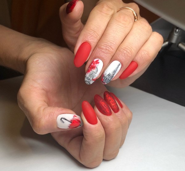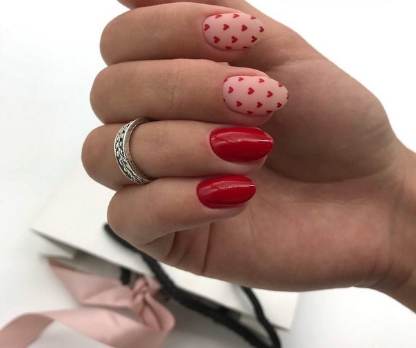 Крім сердечок на нігтях в дизайні манікюру на 14 лютого сміливо застосовуйте червоний колір гель лаку, матовий ефект і оксамитові пудрові ефекти, що в тандемі з романтичними принтами дозволять створити чудовий манікюр на День закоханих.
