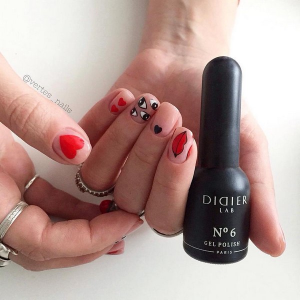 Цікавим виявиться інтерпретація дизайну нігтів з сердечками на 14 лютого в техніці «color block», «deep design» і «negative space». В тренді дивовижні малюнки з особами або фігурками, портретами і оченятами, доповнені сердечками, чудові для модного дизайну нігтів на День Валентина.