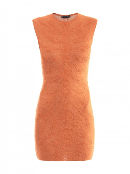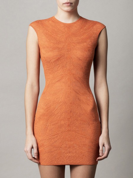 Олександр Маккуїн високої моди орган з фігурного визначають силуети, з цим помаранчевим бабка жакардові сукні вишукано скульптури в текстуру тканини.