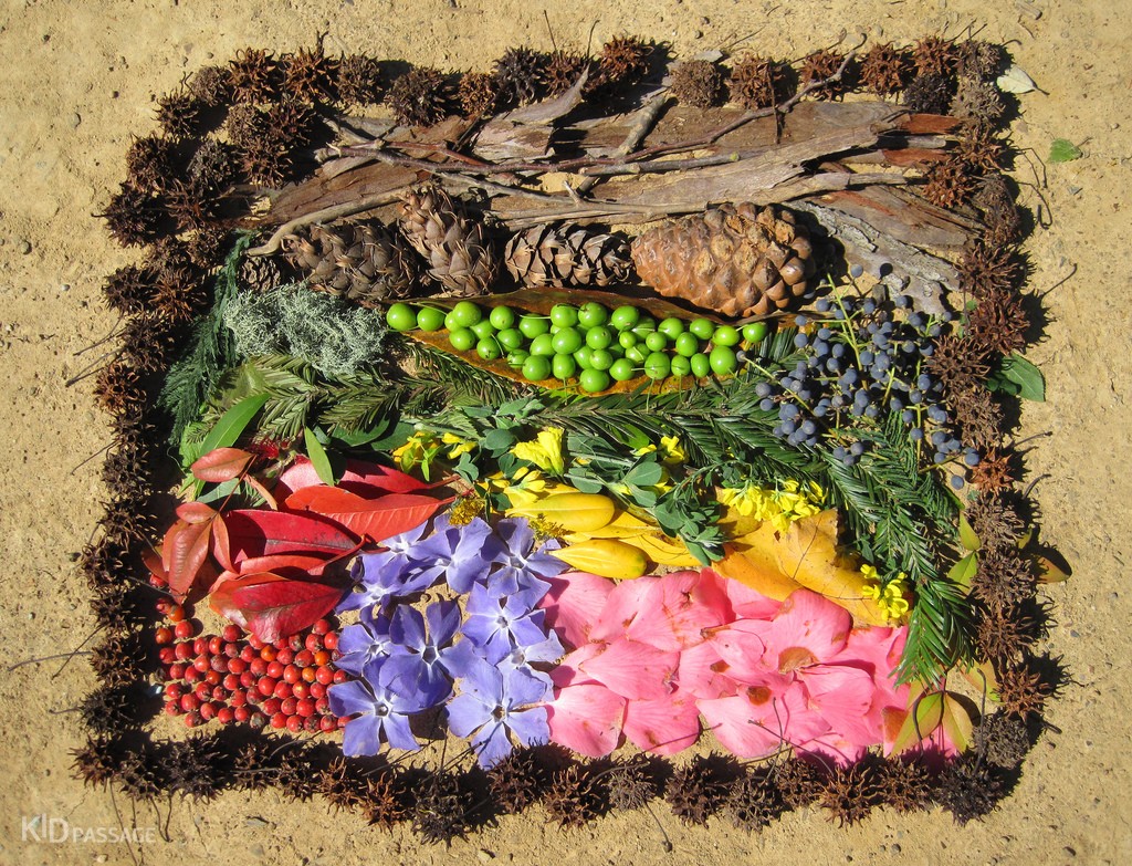 Знадобиться: листя, гілки, шишки, овочі, фрукти, камені, загалом, все що завгодно. Ще довго до того моменту, як діти в садках і школах почнуть клеїти композиції з природних матеріалів. А на природі їх не обмежують фантазію розміри листків та тривалість уроків. Можна викладати на галявині абстрактні композиції, симетричні мандали, портрети рідних. Орнамент з гілок, листя, насіння клена або каштанів прикрасить бордюр в парку, а збір врожаю на дачі можна завершити створенням малюнка з ягід і плодів.