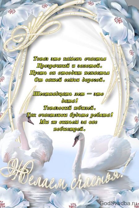 Шістнадцята річниця – це топазовая весілля. Не дарма цієї дати дав назву напівкоштовний камінь, як топаз. Прийнято вважати, що він може обдарувати красою жінок, а чоловіків зробити більш розважливими, здатний підсилити почуття любові і дружби, а також вберегти від багатьох хвороб. Символічно і те, що топаз, незважаючи на свою ніжність і витонченість, камінь, який дуже важко розбити. Так і сім’я, за 16 років шлюбу стала настільки міцною і дружньою, при цьому не втративши всій ніжності і трепетности своїх почуттів.