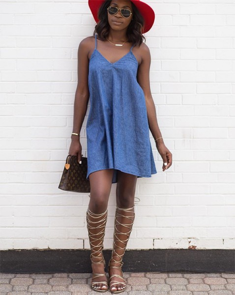 15. Такі серйозні речі, як сандалі-гладіатори і капелюх з вільними полями, чудово працюють з маленьким джинсовим одягом.
