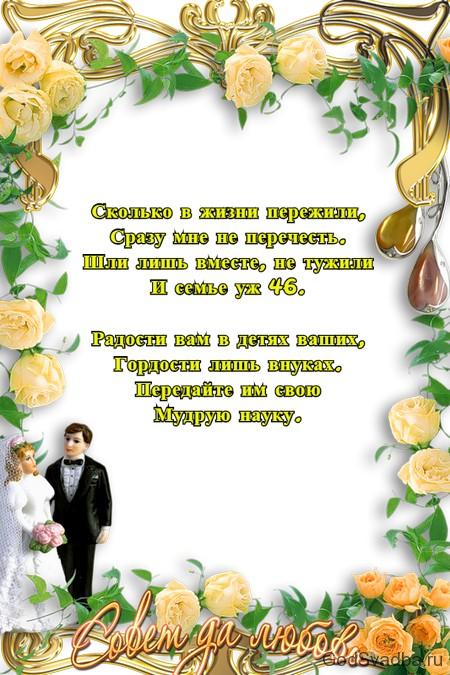 Так як захід має квіткову спрямованість, рекомендується провести цей вечір в романтичній обстановці. За 46 років спільного життя, романтичні відносини втрачають свою яскравість. Тому родичам, а краще, якщо це зробить сестра дружини або сестра чоловіка, необхідно налаштувати винуватців торжества на романтичний настрій. Для створення такого настрою сестра повинна відвернути пару від побутових питань. Для цього необхідно організувати їм прогулянку або купити квитки на який-небудь захід. Наприклад, на виставку або в театр.