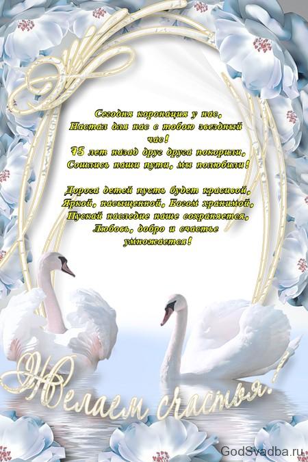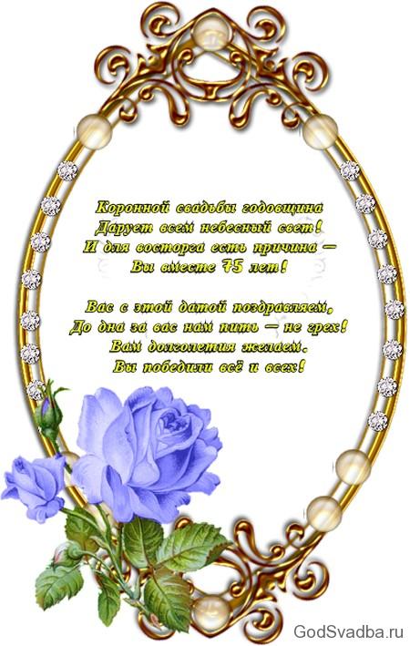 75 років шлюбу мають свої особливості проведення. Тому варто підготувати відповідні привітання з цією датою. Коронної весіллям повинні займатися діти, онуки і правнуки. Адже для ювілярів організація свята може бути непосильним завданням.