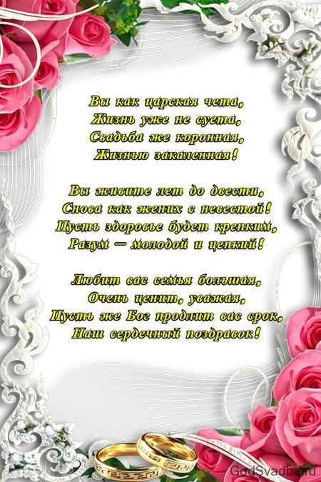 Коронне весілля — дуже рідкісне явище в сучасному соціумі. Для того, щоб прийняти поздоровлення з такою річницею слід прожити в шлюбі не менше 75 років. Це практично все доросле життя. Про таких парах можна тільки писати вірші.