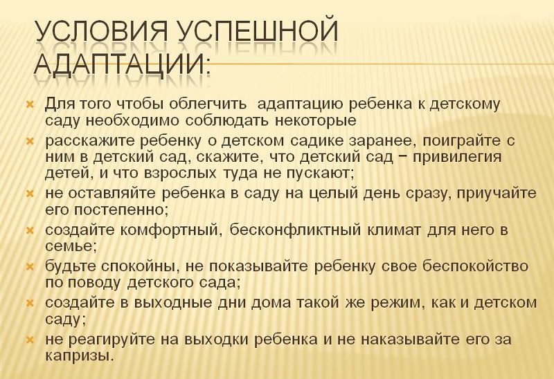 У чому протікання цього періоду залежить від характеру самої дитини і його психологічних особливостей. На неї впливає і рівень професіоналізму педагога, під керівництвом якого проходить адаптація малюка. Грамотна консультація педагога дозволить батькам правильно підготувати дитини до саду і налаштувати його на потрібний лад.