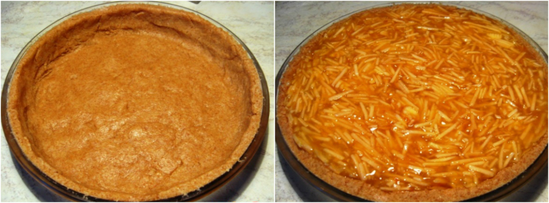 Розкачай тісто розподілити по дну і бортикам форми. Для цього пирога зручно використовувати форму з роз’ємними бортиками. Вилий пудинг з яблуками у форму.
