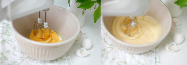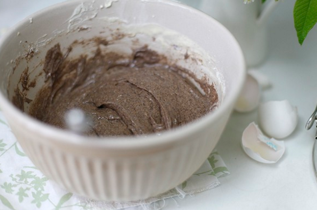 Яйця розбити в миску і збити їх, використовуючи міксер, потім всипати цукор, і знову продовжити збивання, до тих пір поки він повністю не розчиниться. Після потрібно ввести сметану, і знову продовжити збивання. Два види борошна з’єднати разом з розпушувачем і розмішати. Невеликими порціями ввести в сметанно-яєчну суміш.